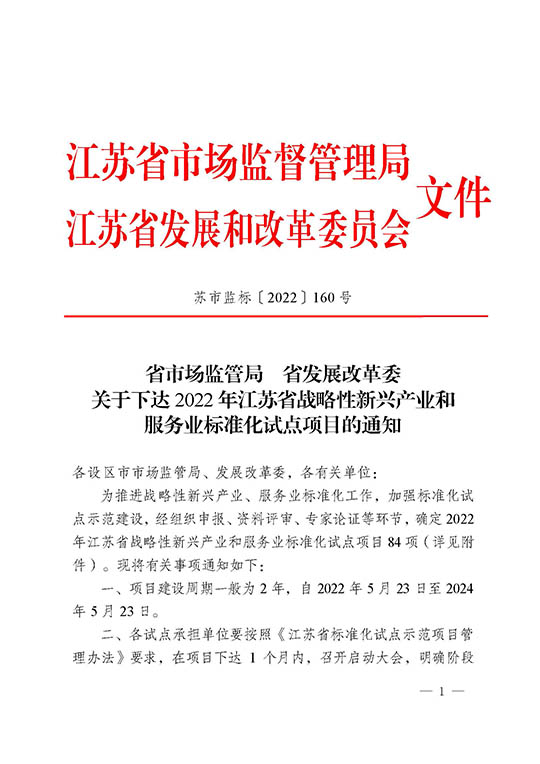 江蘇省戰(zhàn)略性新興產(chǎn)業(yè)標(biāo)準(zhǔn)化試點(diǎn)項(xiàng)目由省市場(chǎng)監(jiān)督管理局和省發(fā)展和改革委員會(huì)共同組織。項(xiàng)目對(duì)申報(bào)單位有著明確的要求:市場(chǎng)占有率和經(jīng)濟(jì)效益排名位于本地區(qū)同行業(yè)前列,具有良好的發(fā)展?jié)摿Γ邆浣y(tǒng)籌技術(shù)創(chuàng)新、標(biāo)準(zhǔn)研制和產(chǎn)業(yè)化的能力等等。